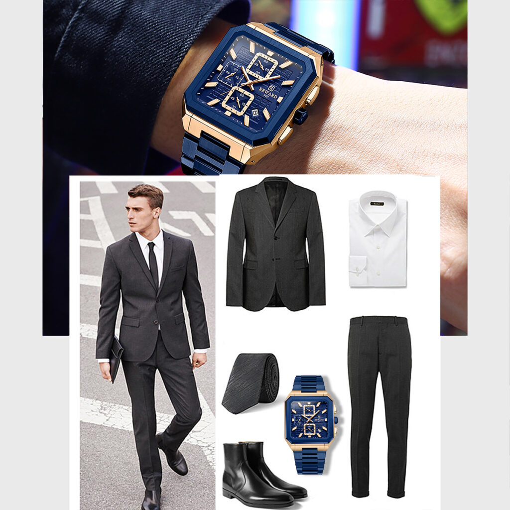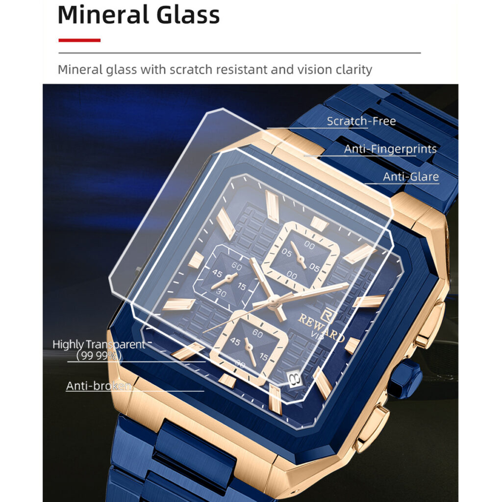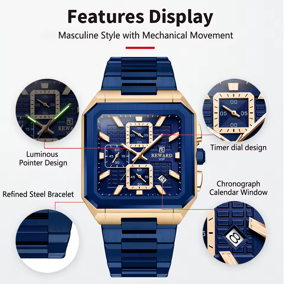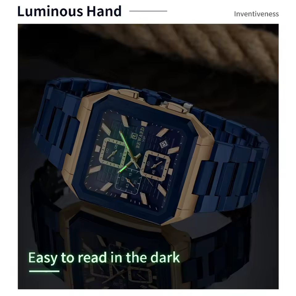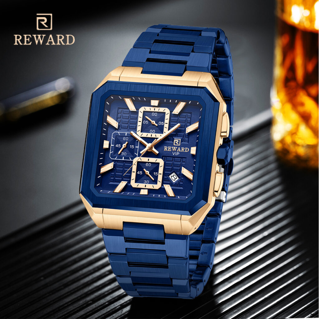 The Reward Fashion Men Square Case  Waterproof Quartz Watch is a sophisticated timepiece that merges style, durability, and functionality. Designed for both casual and formal occasions, it features a sleek square case that adds a modern touch to any outfit.